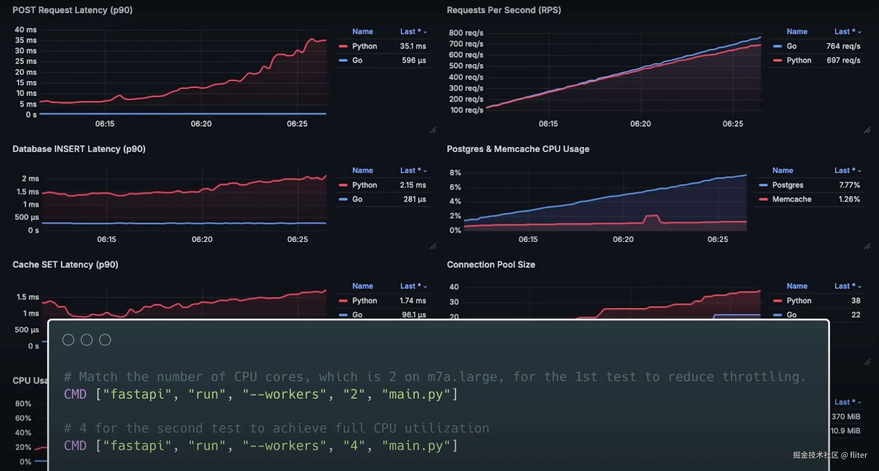 - 在过去的测试中,Python 应用的 CPU 使用率通常远高于其他语言。