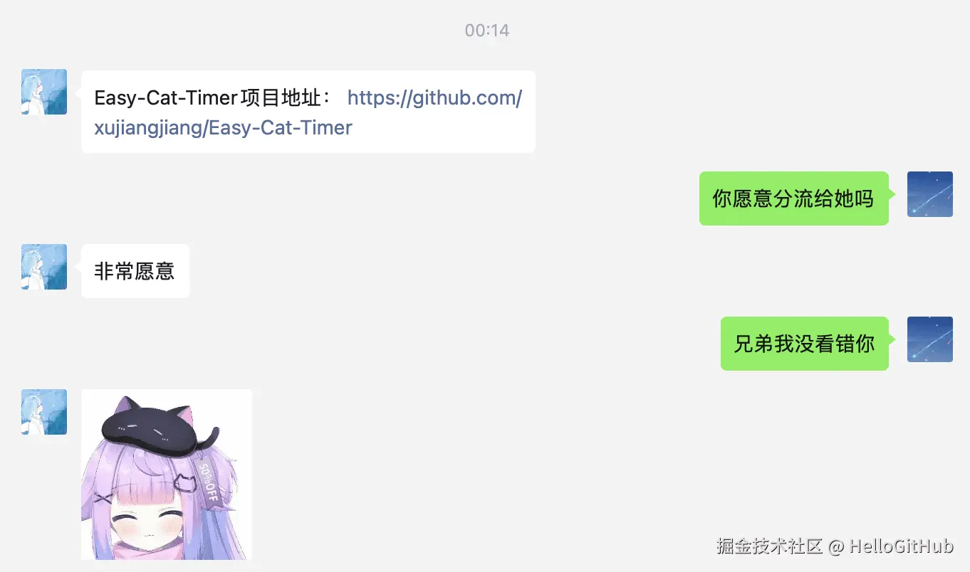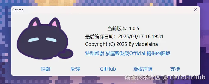 最后,在与 vladelaina 的沟通中,我真切地感受到他对开源那份纯粹的热爱,这正是 HelloGitHub 一直在寻找的「有温度、有故事的开源项目」。也正是因为这份热爱,Catime 一路走来,才会有无数素未谋面的人用爱为它充值。这一切都是意料之中的,因为 Catime 生于热爱,也在传递爱!