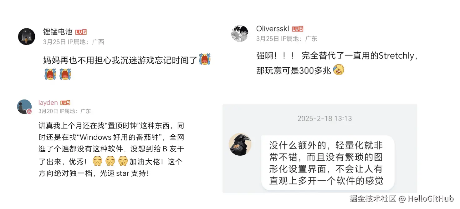 原本以为软件做到这里就足够了。然而,随着项目开源和第一个演示视频的发布,Catime 意外地收获了大量用户的奇思妙想、建设性反馈和热情的支持。