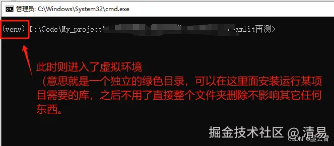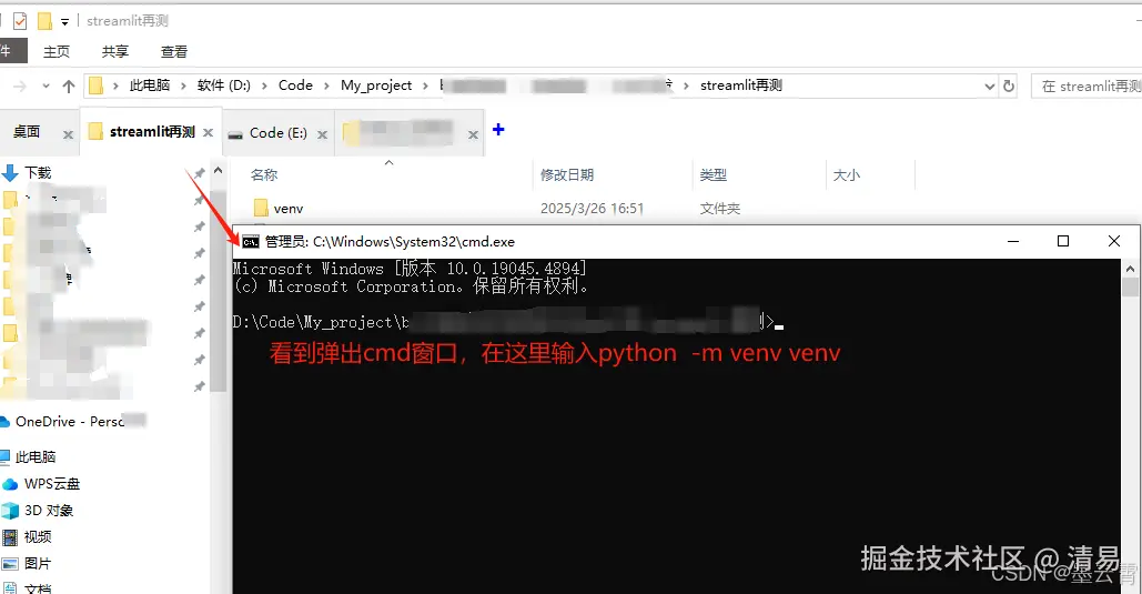 2. Python安装虚拟环境 清易 2025-04-01 72 阅读1分钟 (如何安装python见上一篇) 1. 进入目录文件夹打开cmd 方法1. win按键输入cmd回车 方法2. 文件夹路径输入cmd加车 2.打开cmd后输入命令 # 创建虚拟环境 python -m venv venv # 完成后文件夹内有venv文件夹,输入命令进入环境里 venv\Scripts\activate