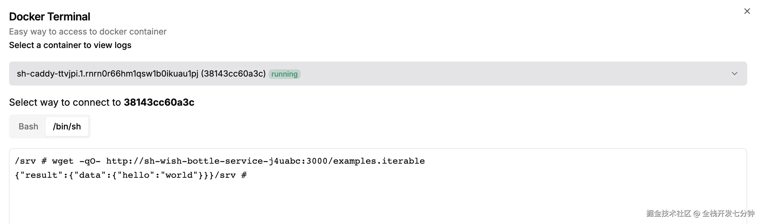 通过这个别名,我们通过在 caddy 的 terminal 中执行命令,就可以访问到 wish-bottle-service 的内网服务,我们来测试一下。