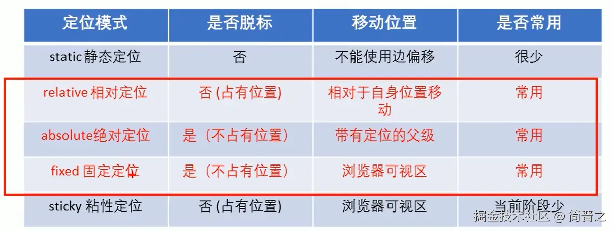 ⚠注意: 粘性定位和相对定位的特点基本一致,不同的是:粘性定位可以在元素到达某个位置时将其固定。