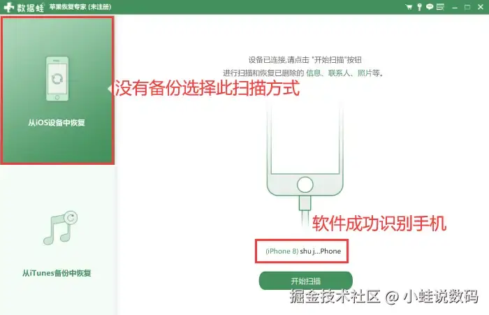 步骤1:将手机连接到电脑上,启动软件确保软件已成功识别手机,选择 【从iOS设备中恢复】 的模式扫描手机。