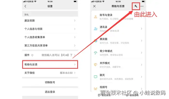 步骤1:选择微信的 【设置】 中,找到并进入 【帮助与反馈】 ,点击右上角的 【扳手】 进入。