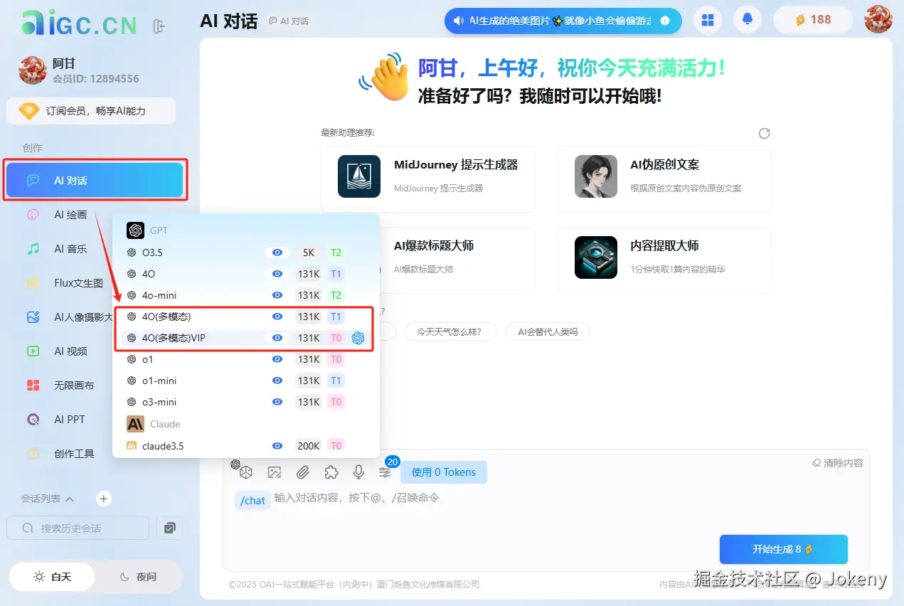 选择AI对话,再选择对应的模型即可体验4O多模态模型,如下图: