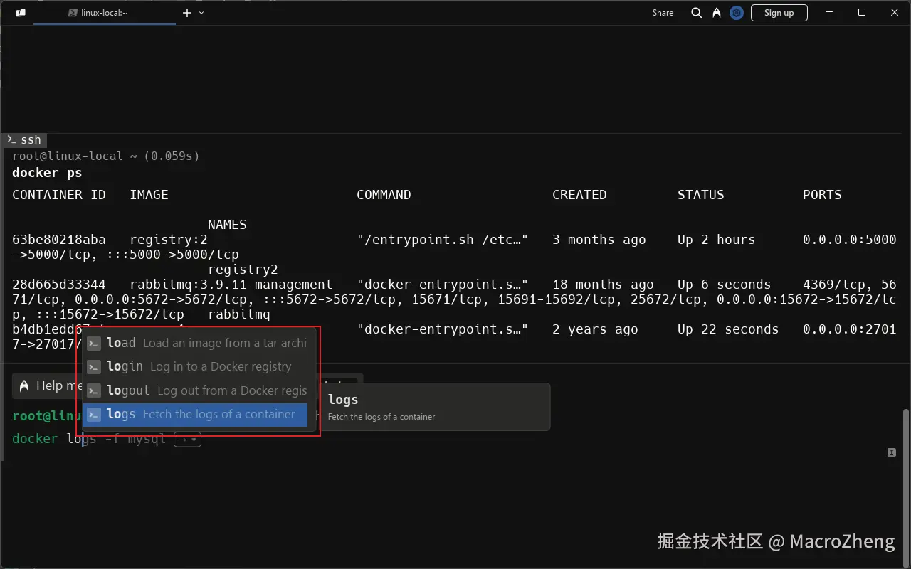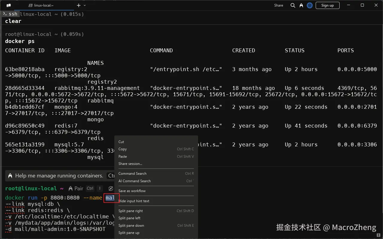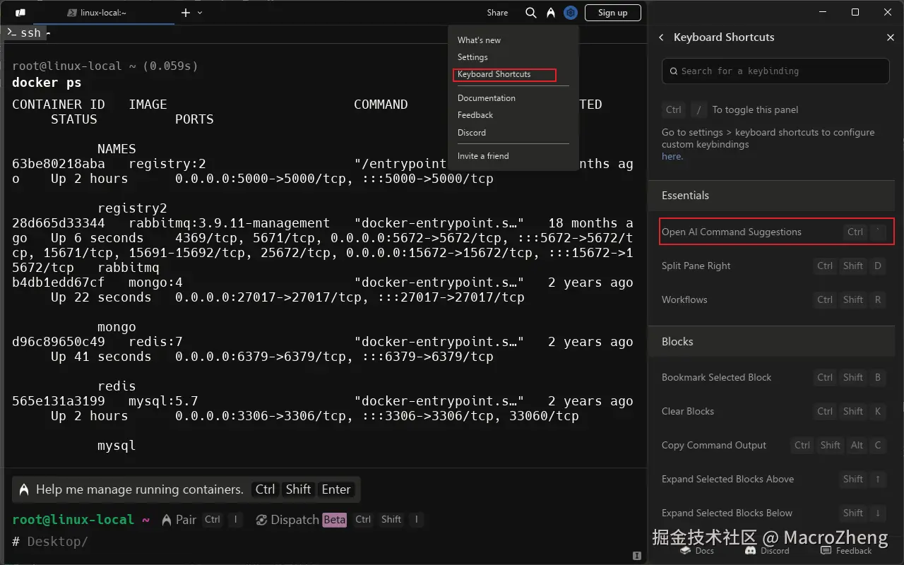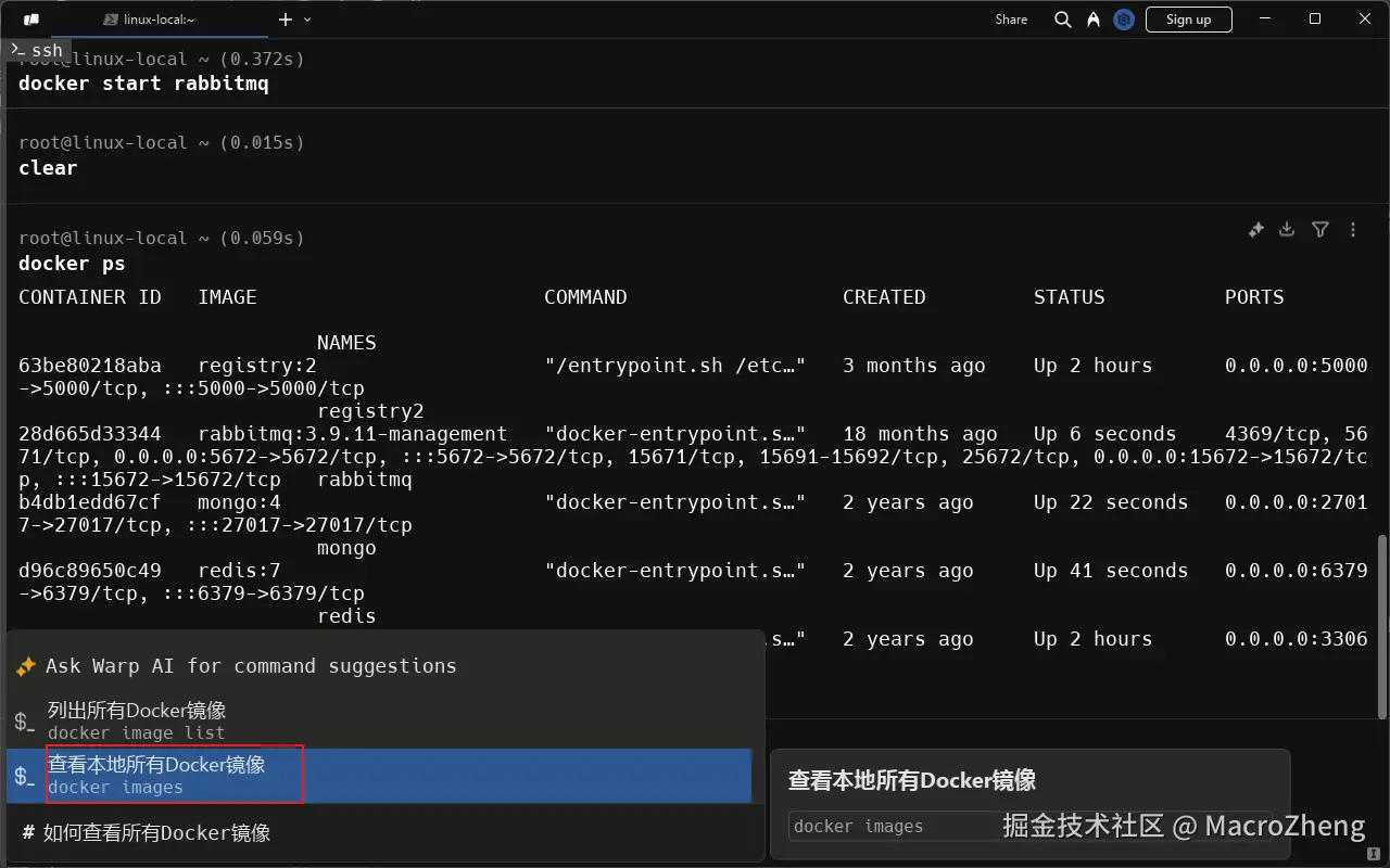 Ctrl+·来调用AI Command,例如提问如何查看所有Docker镜像,Warp会把对应的命令告诉你;