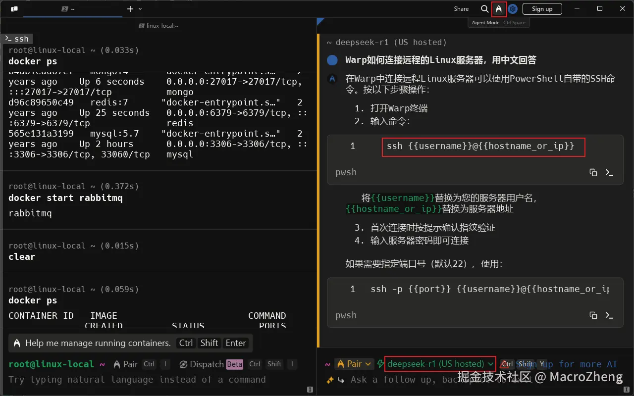 Agent Mode来使用AI功能,我这里提问Warp如何连接远程的Linux服务器,可以切换使用DeepSeek大模型;