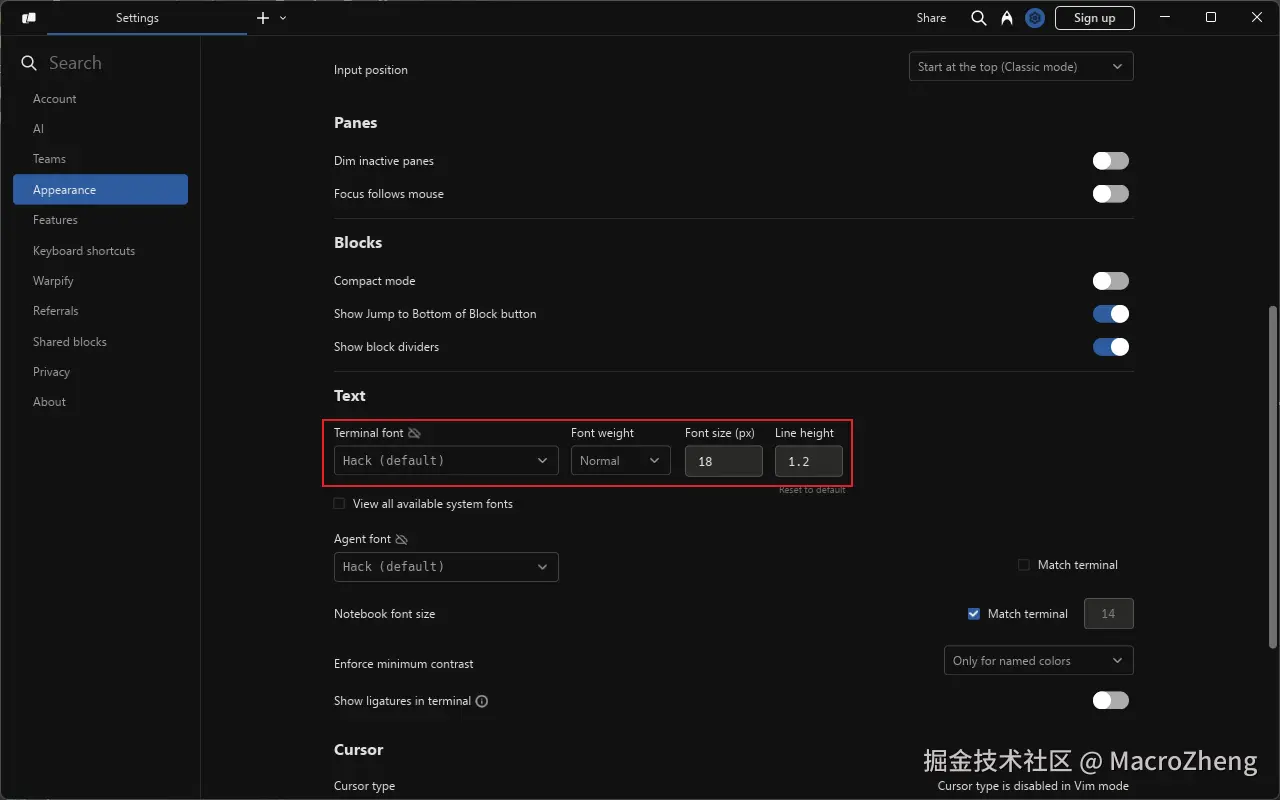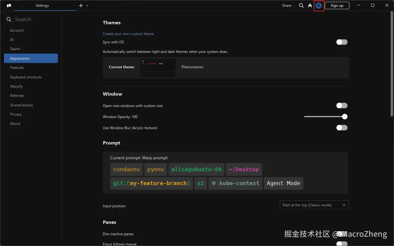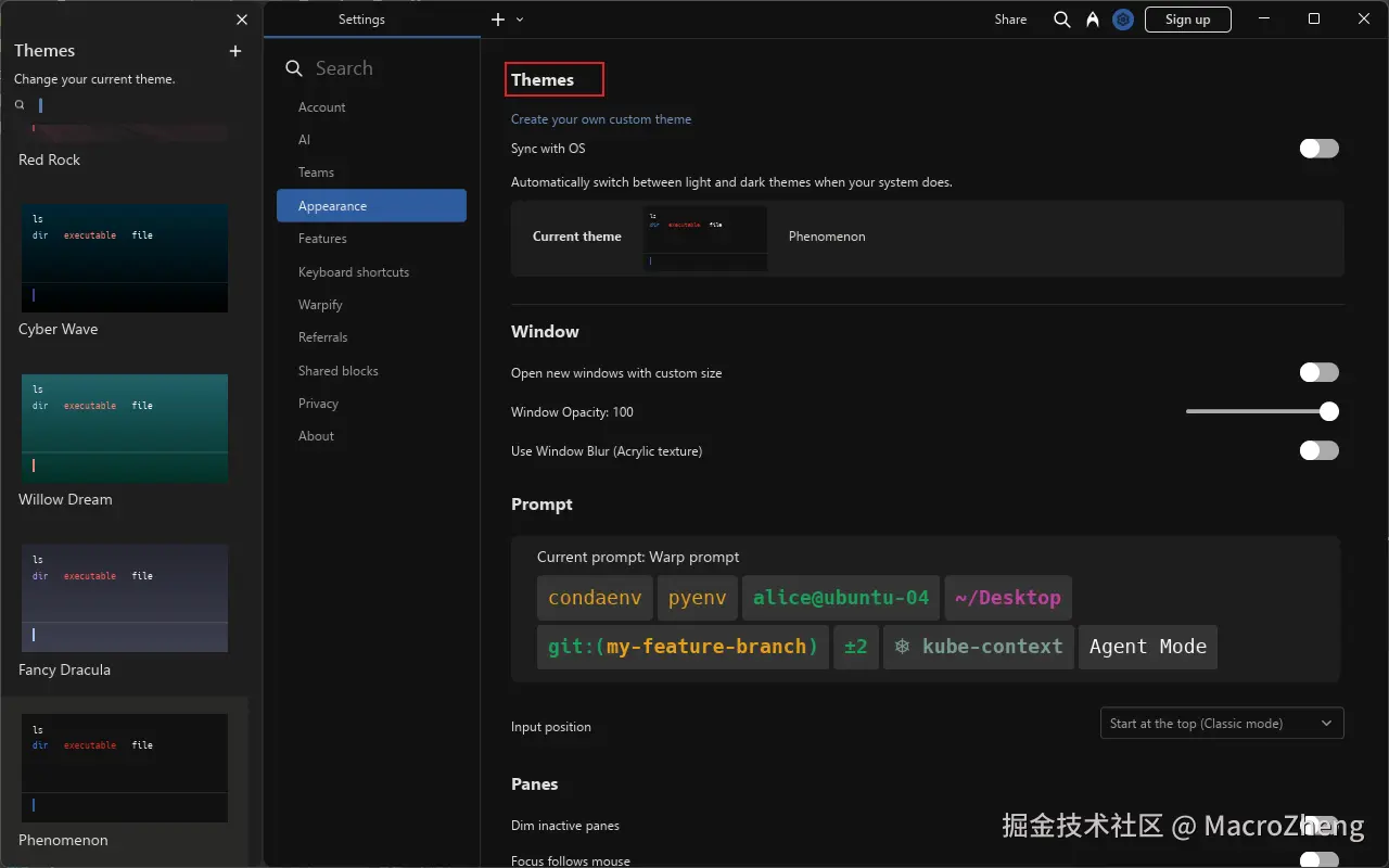 - 例如进行主题的设置,Warp支持多达10种主题;