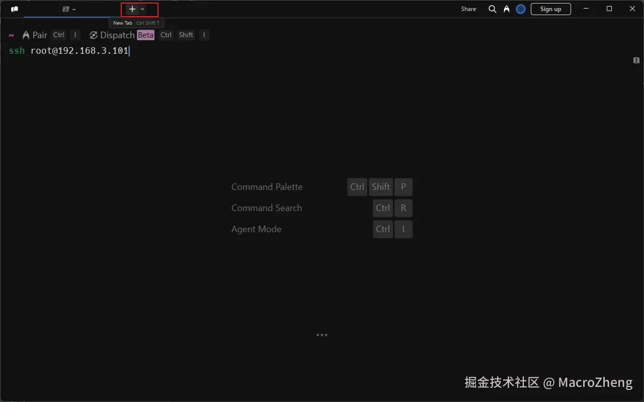 - 首先我们可以通过顶部的加号来添加一个tab,然后通过ssh命令去连接远程的Linux服务器;