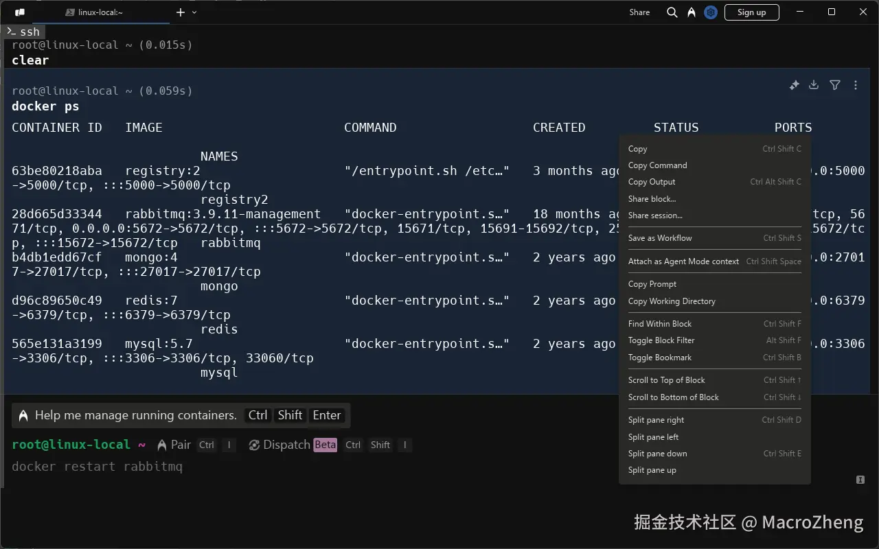 - Warp和传统的终端工具使用起来有所不同,它的命令输入栏永远在最下面,而且它会把输入的命令和输出的内容组合成一个block来进行显示,右键这个block还可以进行一些列的操作;