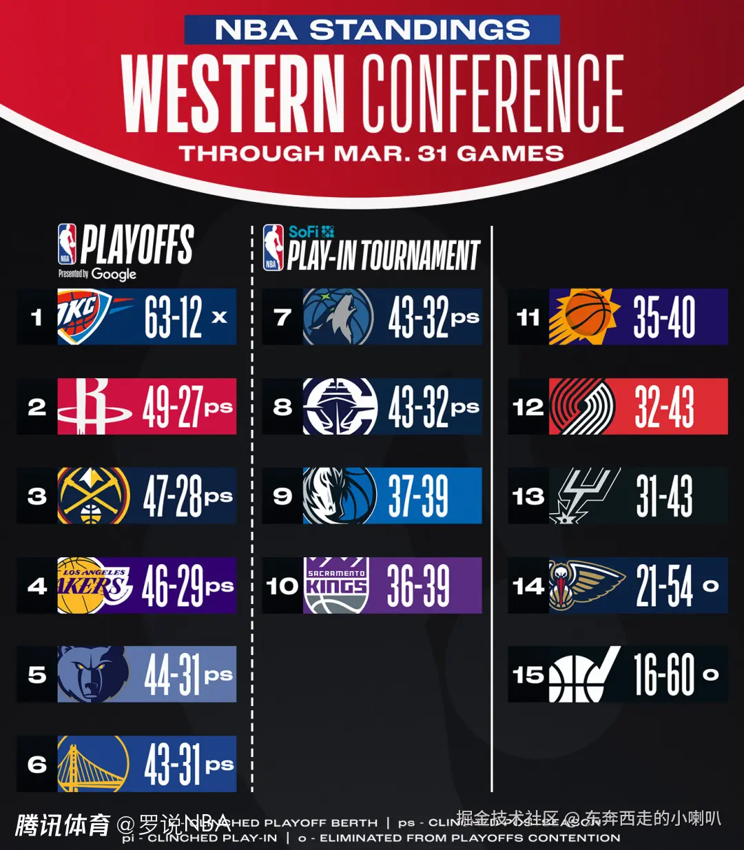 西部季后赛首轮:第1的雷霆对阵8号种子,第2的火箭对阵7号种子,第3的掘金对阵第6的勇士,第4的湖人对阵第5的灰熊
