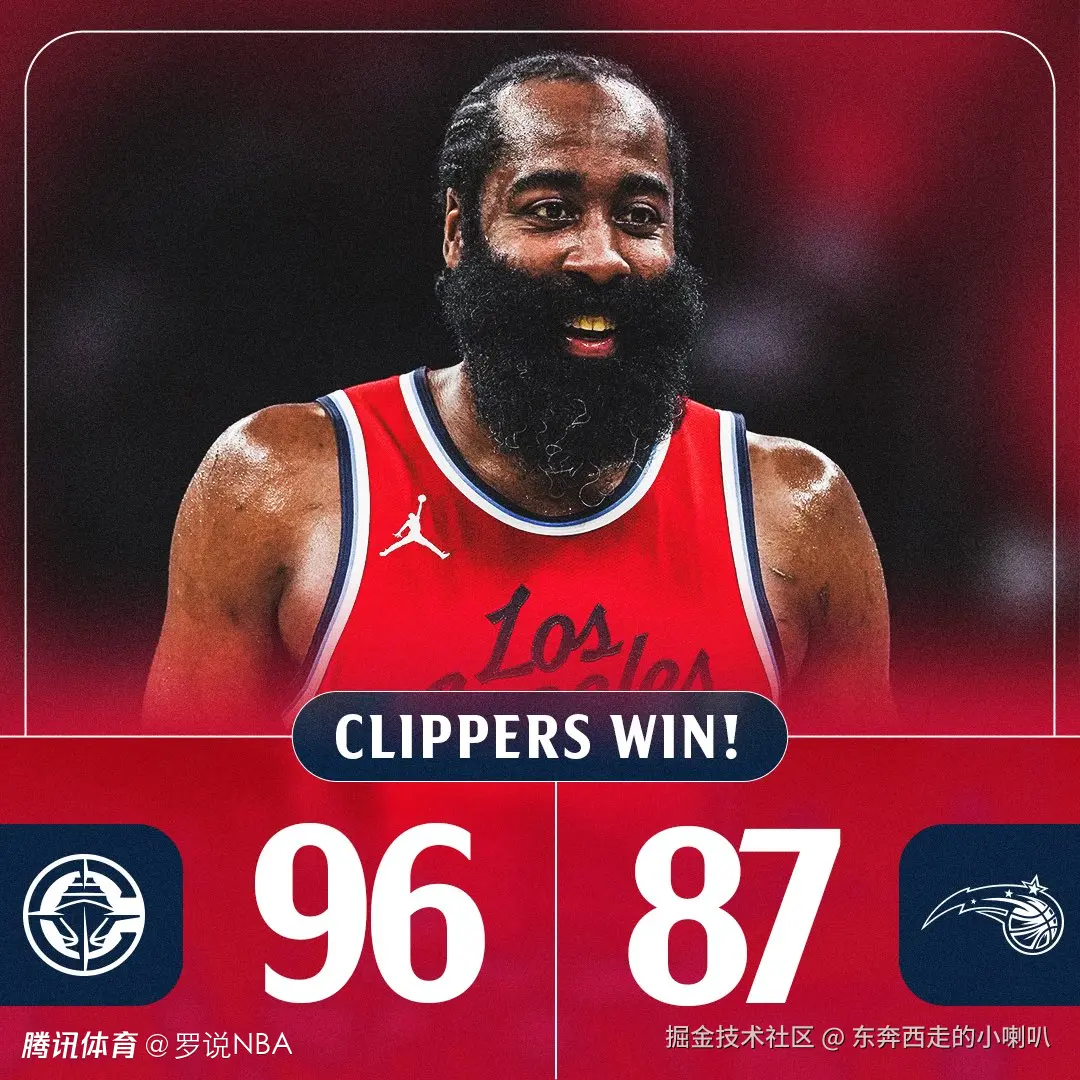 快船击败魔术,战绩与森林狼持平,但由于两队本赛季交锋历史上森林狼3胜0负占优,所以森林狼继续排在第7,快船依然是第8。小卡21分8篮板,哈登20分5助攻7抢断,两人本场都出战近40分钟。哈登7抢断创快船生涯新高,他还解锁了1700抢断里程碑。祖巴茨贡献18分20篮板5助攻。快船距离西部第6的勇士还差0.5个胜场。