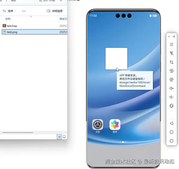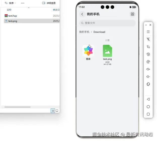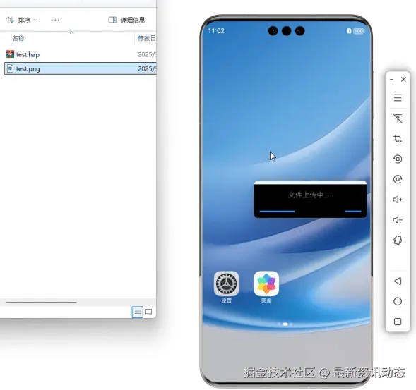 在文件传输方面,模拟器同样提供了便捷的操作体验。开发者可以将图片、文档等文件直接拖拽至模拟器UI界面,实现文件的快速上传,而无需像在真机上那样先开启文件传输功能,然后从电脑端手动复制、粘贴或执行hdc file send命令。