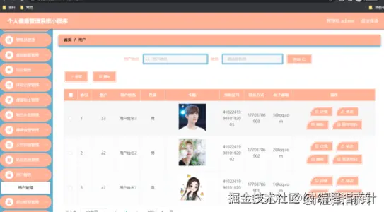 如图5.1显示的就是用户信息管理页面,此页面提供给管理员的功能有:用户信息的查询管理,可以删除用户信息、修改用户信息、新增用户信息,