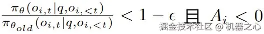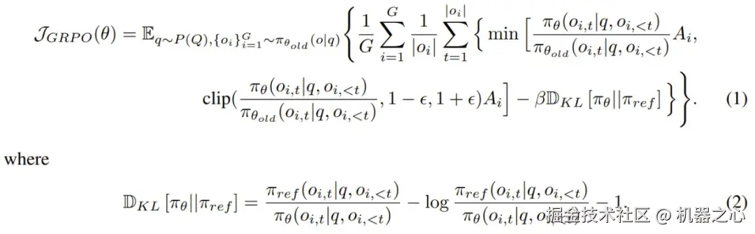 其中,q 是从数据集分布 P (Q) 中采样的问题,{o_1, o_2, ... , o_G} 是 G 个完成结果,π_θ 是策略模型,π_θ_old 是旧策略模型,π_θ_ref 是参考模型,ϵ 和 β 是超参数,A_i 是使用一组奖励 {r_1, r_2, ... , r_G} 计算的优势。
