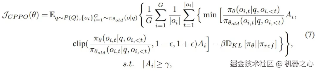 相比于 GRPO,CPPO 引入了一个选择性条件,该条件仅会包括表现出足够高优势的完成结果。CPPO 的目标公式如下: