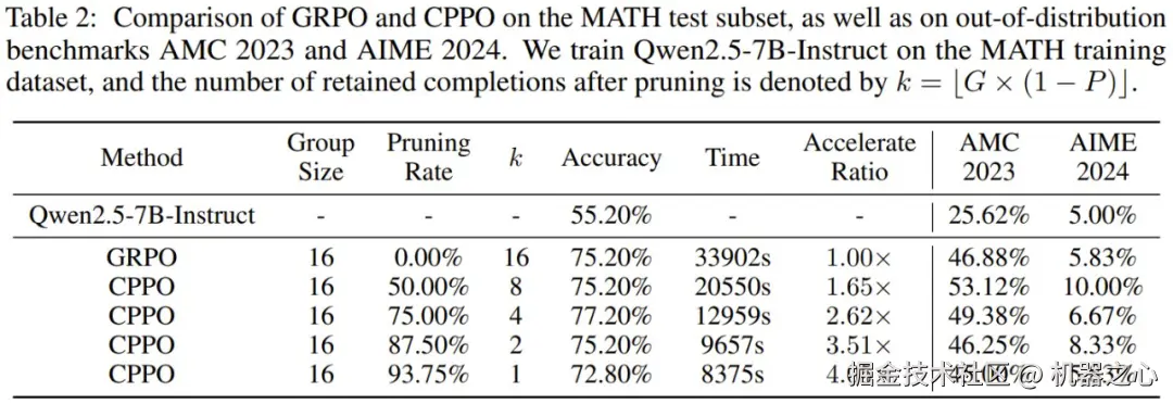 基于这一见解,他们发现可以通过对完成结果进行剪枝来加速 GRPO。然后,他们提出了一种加速版的 GRPO:CPPO(Completion Pruning Policy Optimization / 完成剪枝策略优化)。并且他们也已经开源发布了该算法的代码。