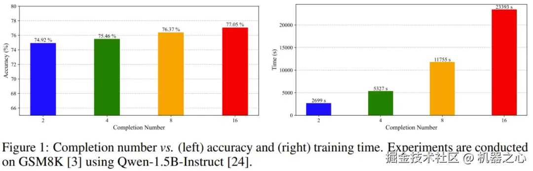 近日,厦门大学纪荣嵘团队研究发现,每个完成结果的贡献与其相对优势有关。也就是说,每个完成结果对策略模型训练的贡献并不相等。如图 1 所示,完成结果的数量增大时,准确度提升并不非常显著,但训练时间却会迅速增长。