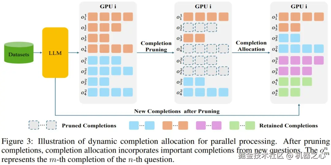 此外,他们还观察到,由于完成剪枝会导致 GPU 资源利用率不足,从而导致资源浪费。为了解决这个问题,他们引入了一种动态完成结果分配策略。该策略会用新问题的完成结果填充每个设备,从而充分利用 GPU 资源并进一步提高训练效率。