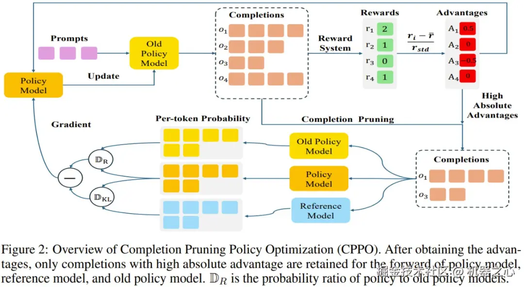 顾名思义,CPPO 会根据优势对完成结果进行剪枝,这样一来就可以提升强化学习过程的速度。