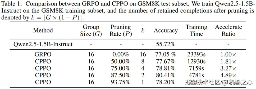 实验证明,他们的方法是有效的。当使用 Qwen-2.5 系列模型时(包括 Qwen-2.5-1.5B-Instruct 和 Qwen-2.5-7B-Instruct),在保证了准确度相当的基础上,CPPO 在 GSM8K 基准上的速度比 GRPO 快 8.32 倍,在 MATH 基准上快 3.51 倍。