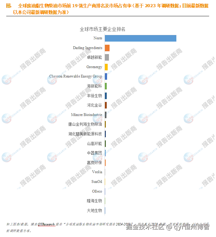 根据QYResearch头部企业研究中心调研,全球范围内废油脂生物柴油生产商主要包括Neste、Darling Ingredients、卓越新能、Greenergy、Chevron Renewable Energy Group、海新能科、丰倍生物、河北金谷、Münzer Bioindustrie、唐山金利海生物柴油等。2022年,全球前十强厂商占有大约85.0%的市场份额。