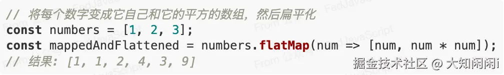 flatMap()方法首先使用映射函数映射每个元素,然后将结果扁平化为一个新数组。