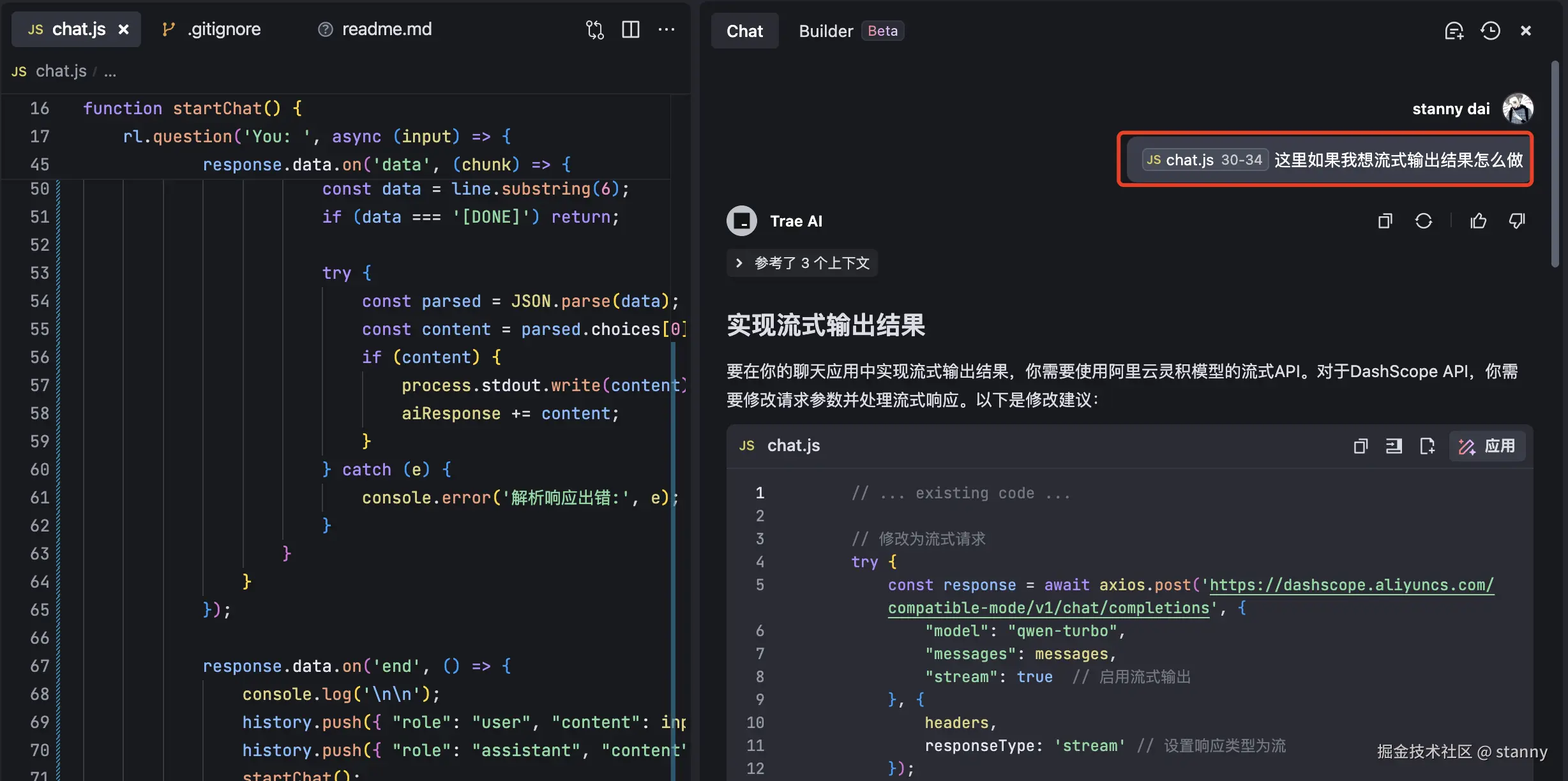 这个优化点我大概清楚接口支持 "stream" 返回,但是具体怎么改造我也不知道,于是我问了 ai