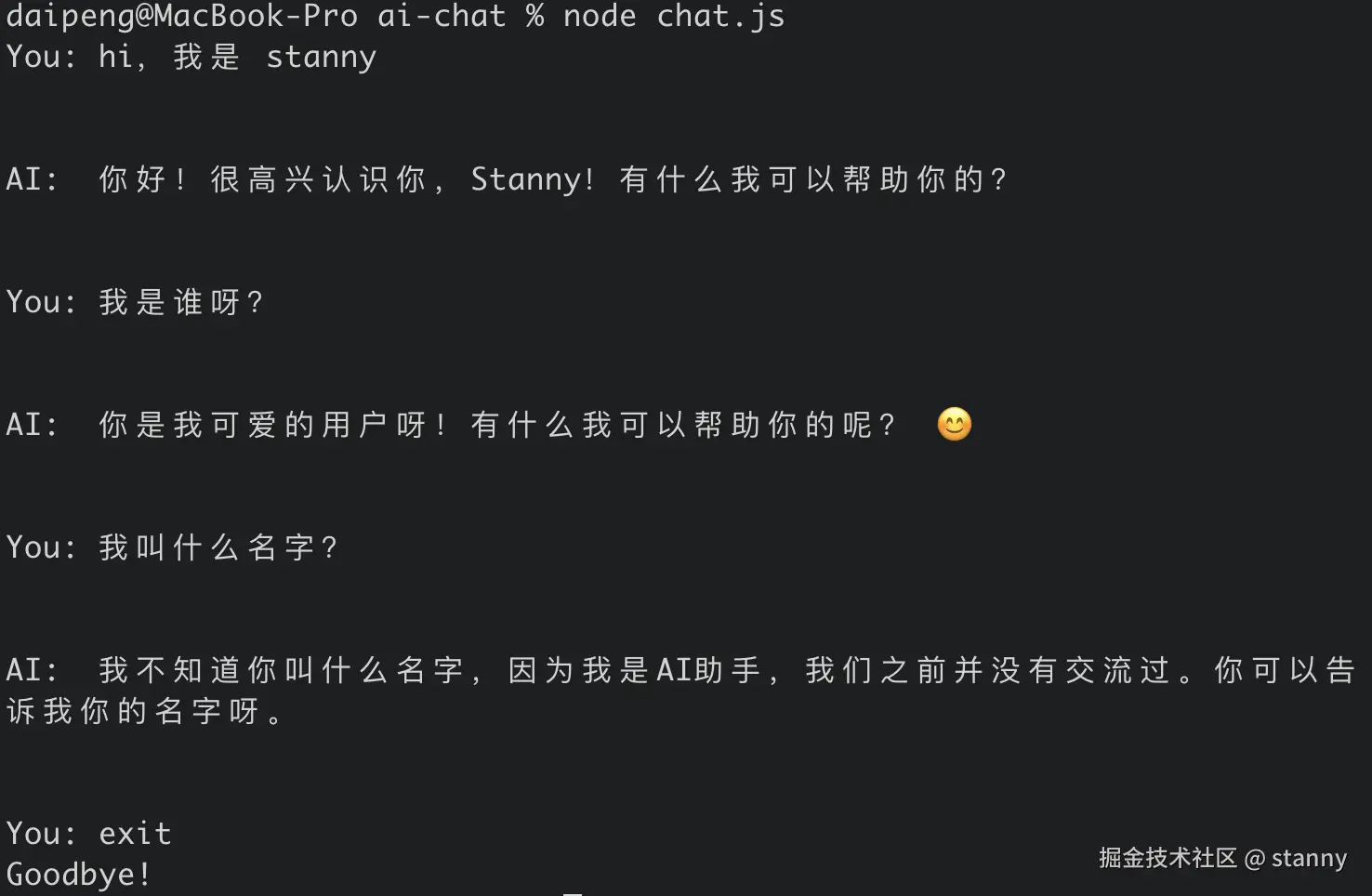 我们实现了持续对话的能力,并且可以通过 exit 来退出当前对话。