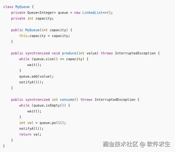 在没有 BlockingQueue 之前,生产者-消费者模式需要自己实现 wait() 和 notify(),例如: