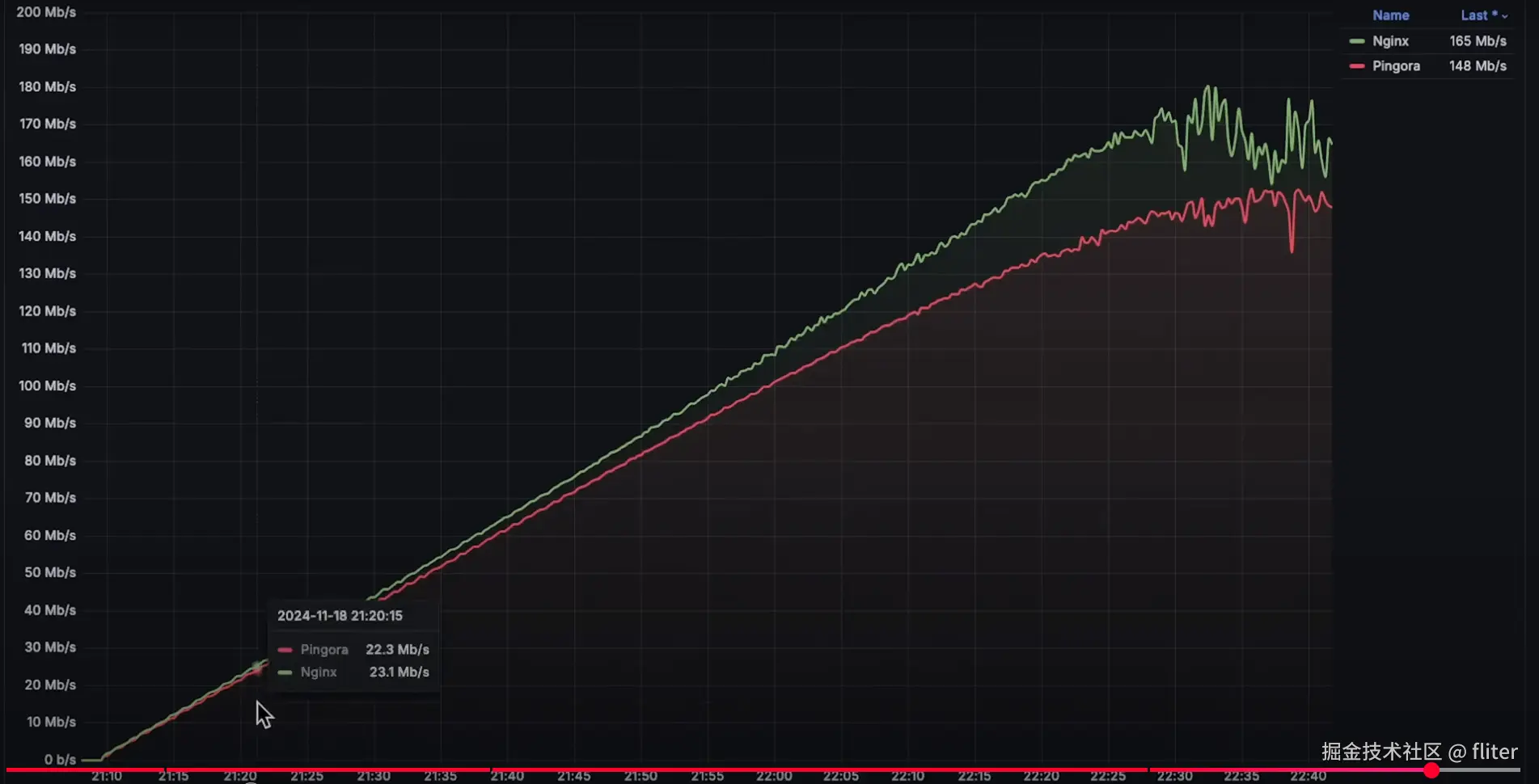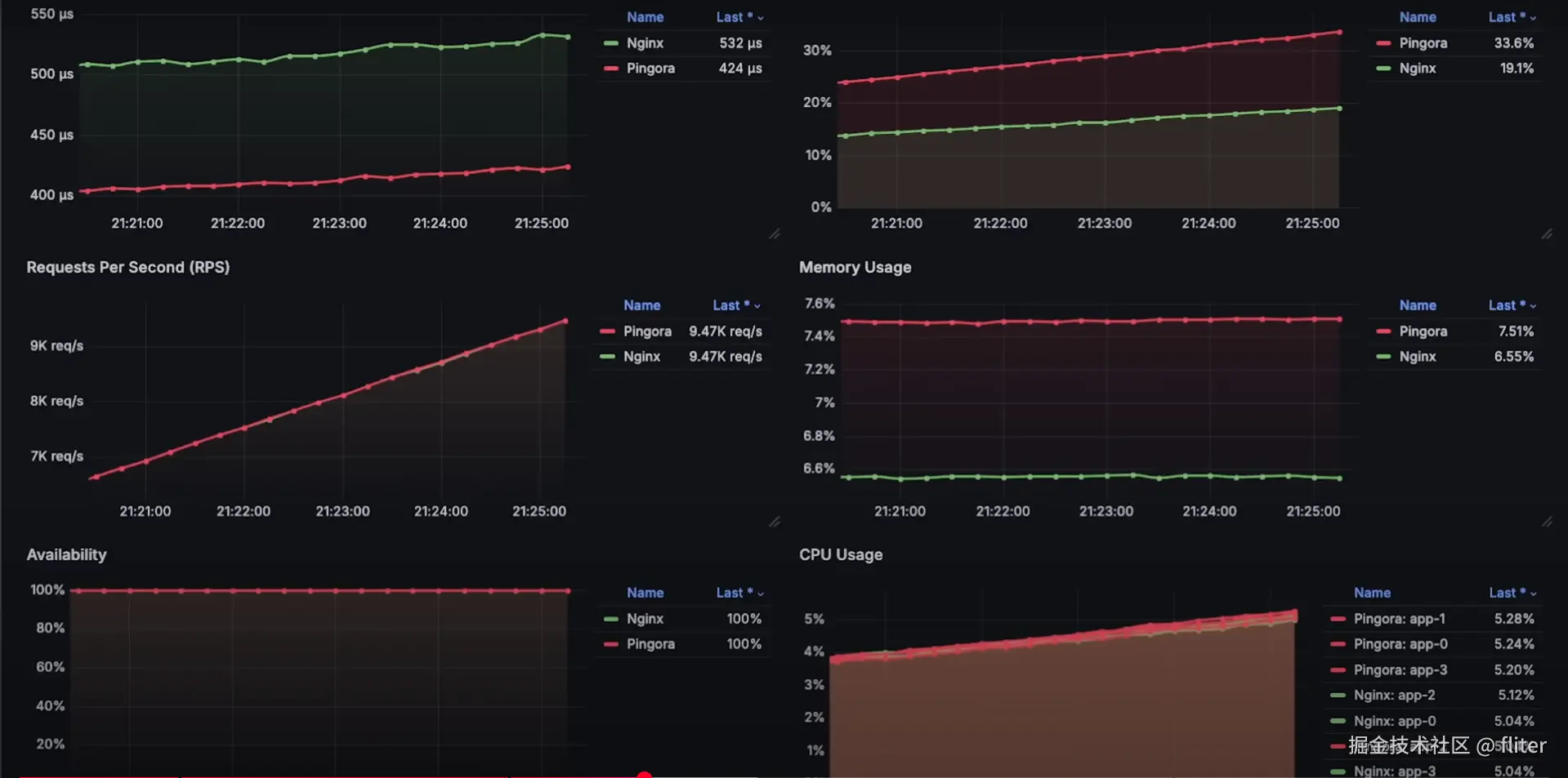 - Nginx 达到了 41,000 请求/秒,而 Pingora 达到了 48,000 请求/秒。