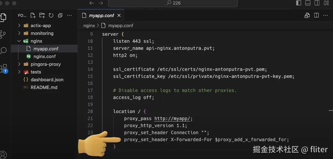 - 添加了一个 X-Forwarded-For 头,将真实的客户端 IP 地址转发到后端应用程序。