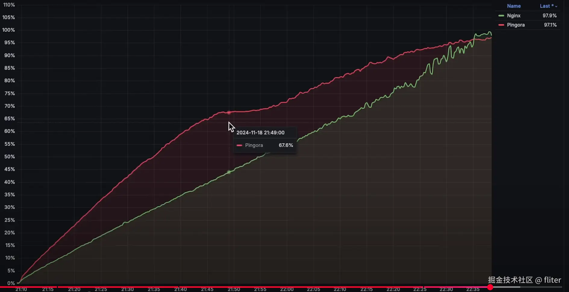 - 起初,Pingora 的 CPU 使用率高于 Nginx,但随着测试的进行,情况发生了变化。