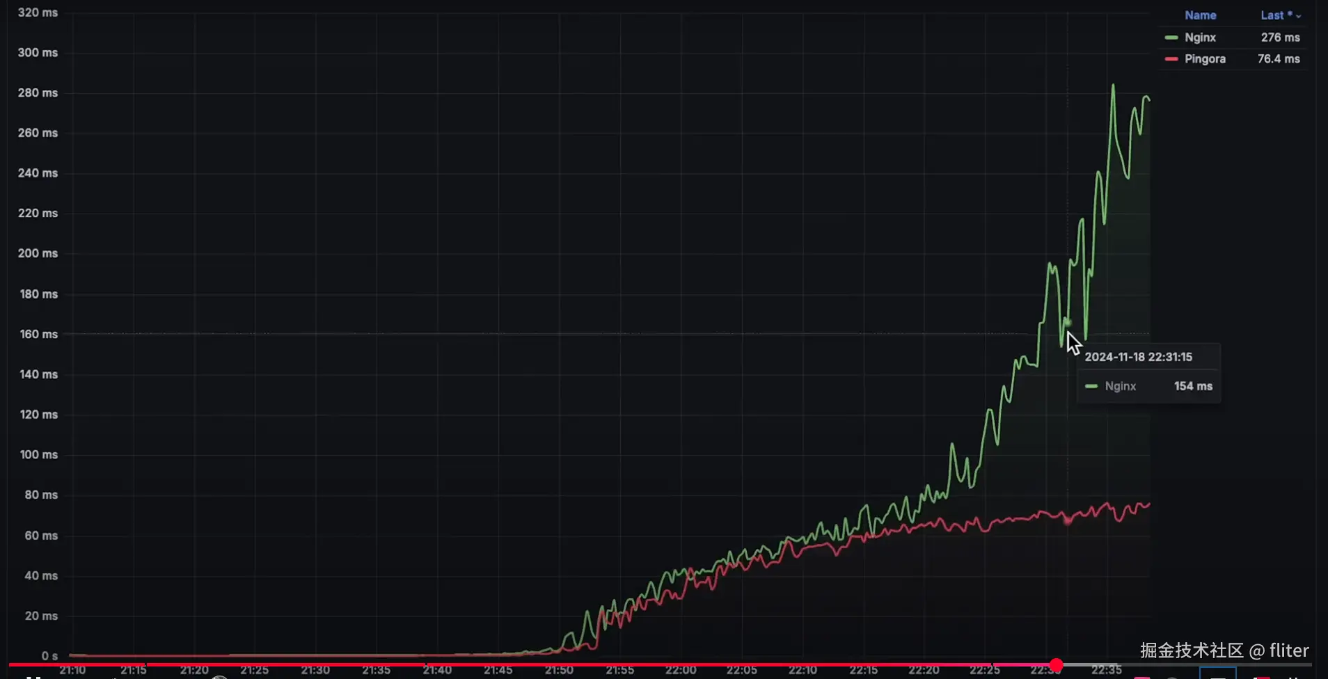 - 从延迟图表中可以看到,在整个测试过程中,Pingora 的延迟始终低于 Nginx 的。在测试初期,延迟非常低时,这可能看起来不重要,但如果你有多个微服务链,每个微服务都由代理(如 Nginx 或 Pingora)处理请求,那么延迟会随着负载的增加迅速累积,尤其是在有 5 个或 10 个微服务的长链时。