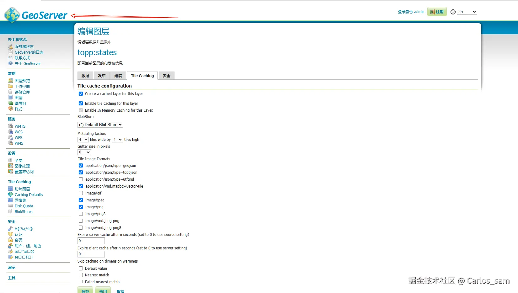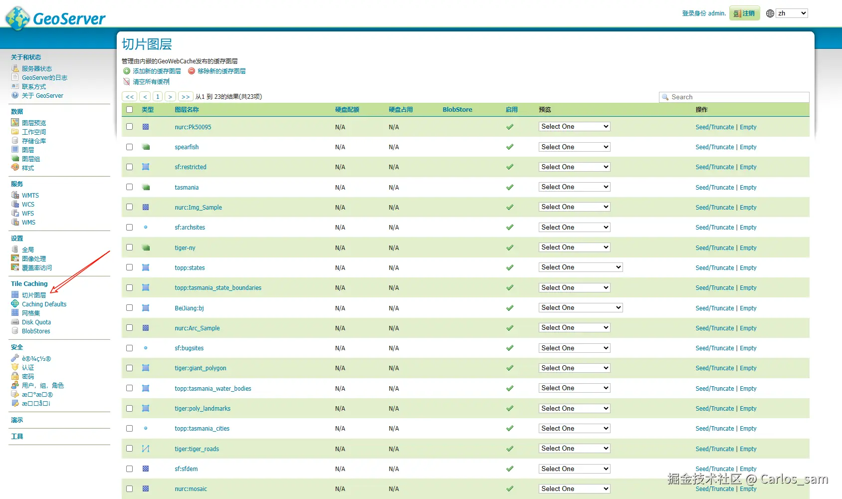 在GeoServer中,进入切片图层页面。