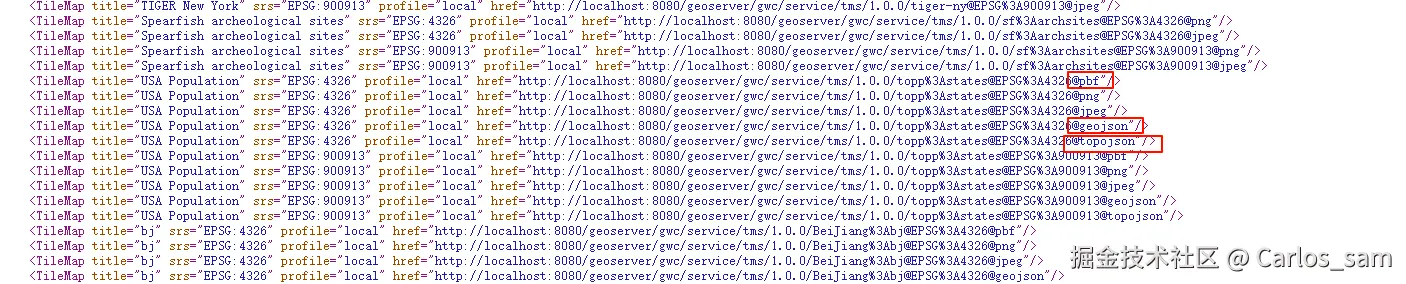 然后就可以拿到一个类似于http://localhost:8080/geoserver/gwc/service/tms/1.0.0/topp%3Astates@EPSG%3A4326@geojson这样的url。这个url由几个部分组成: