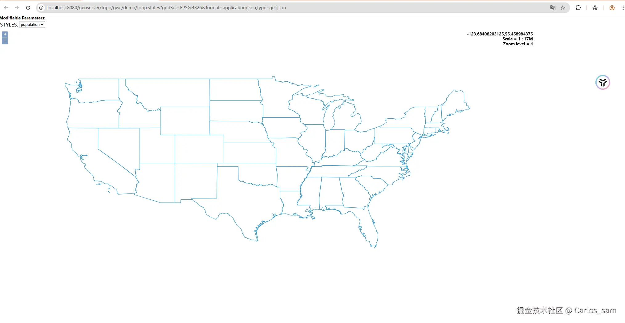 这里我就随便选择了一个GeoServer中的美国人口的矢量面图