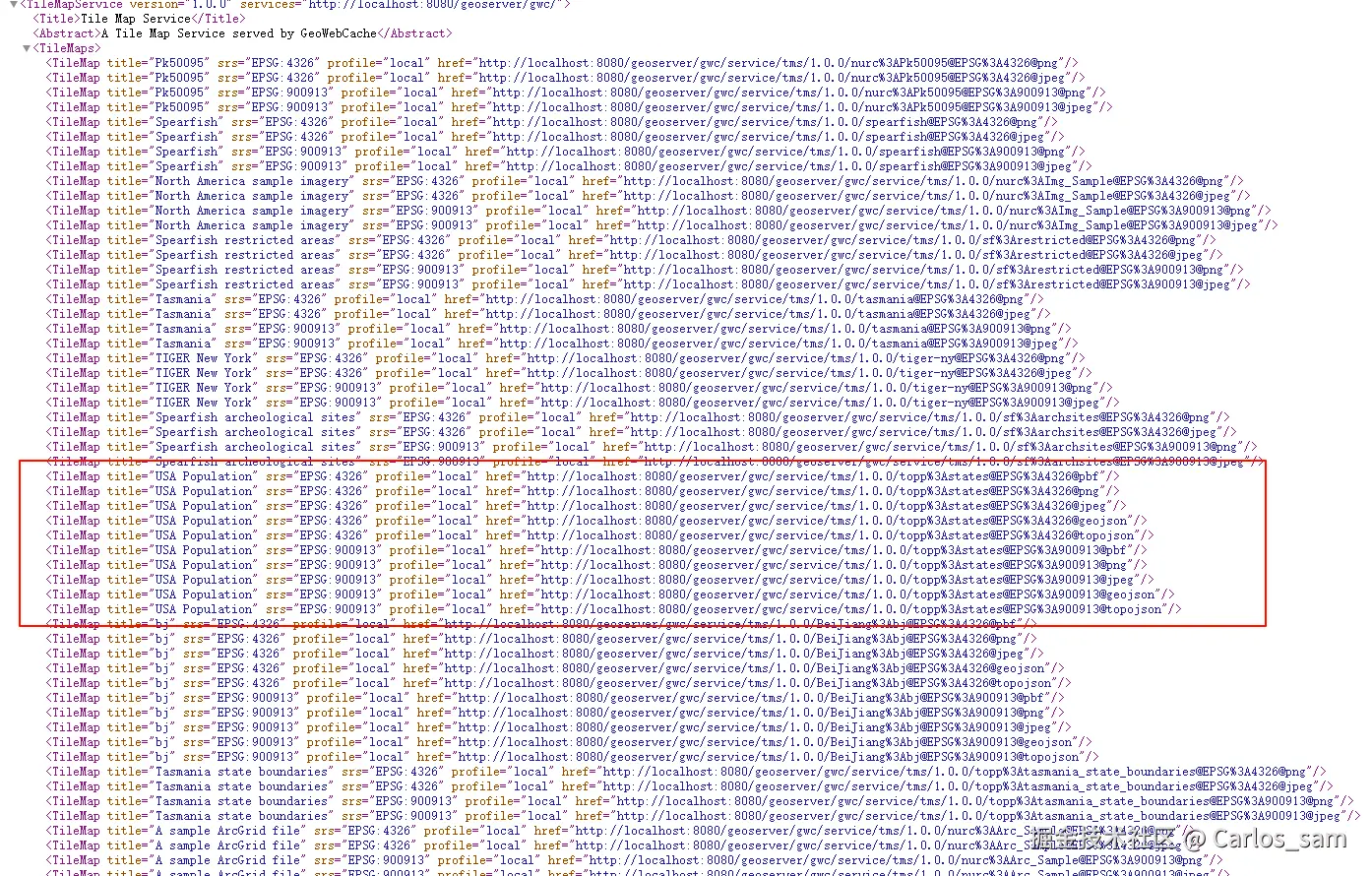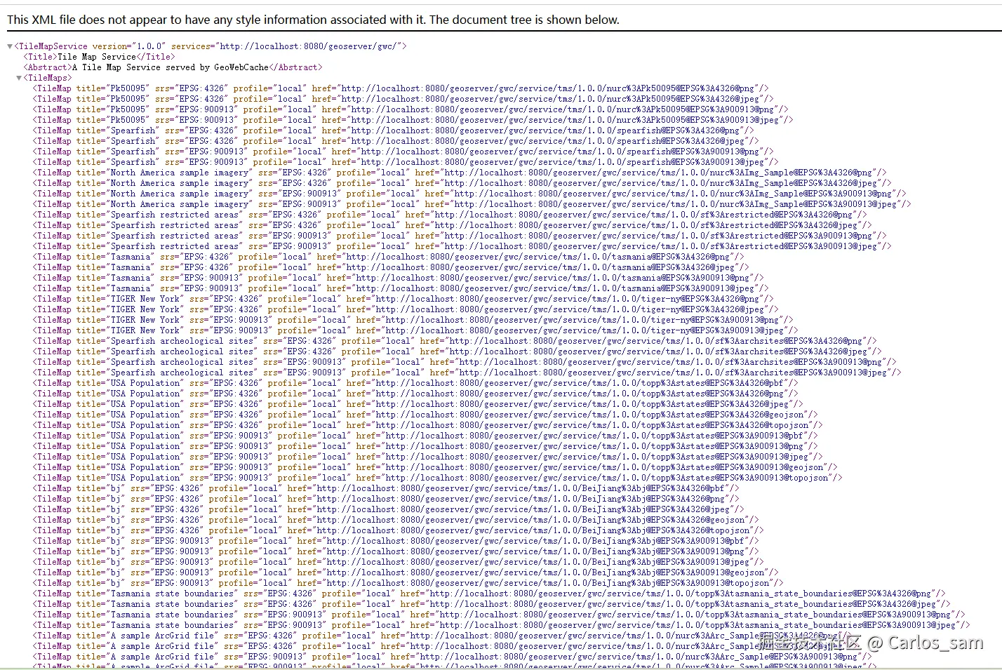 进入的这个页面中就记录了目前我的这台GeoServer服务器上发布的所有TMS服务的url。