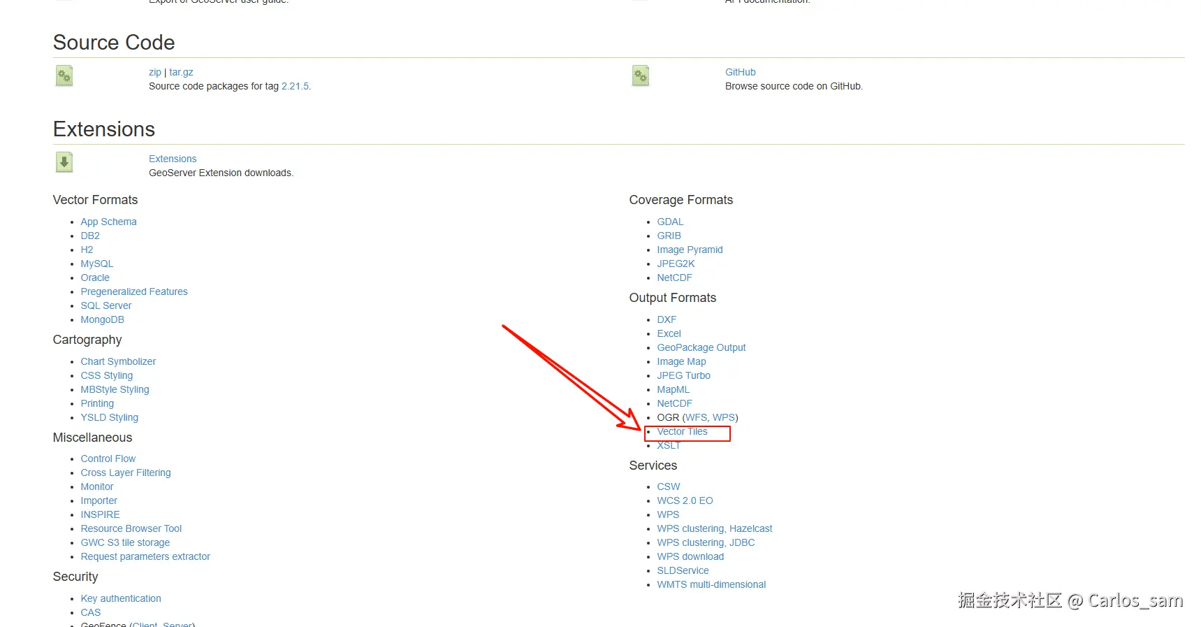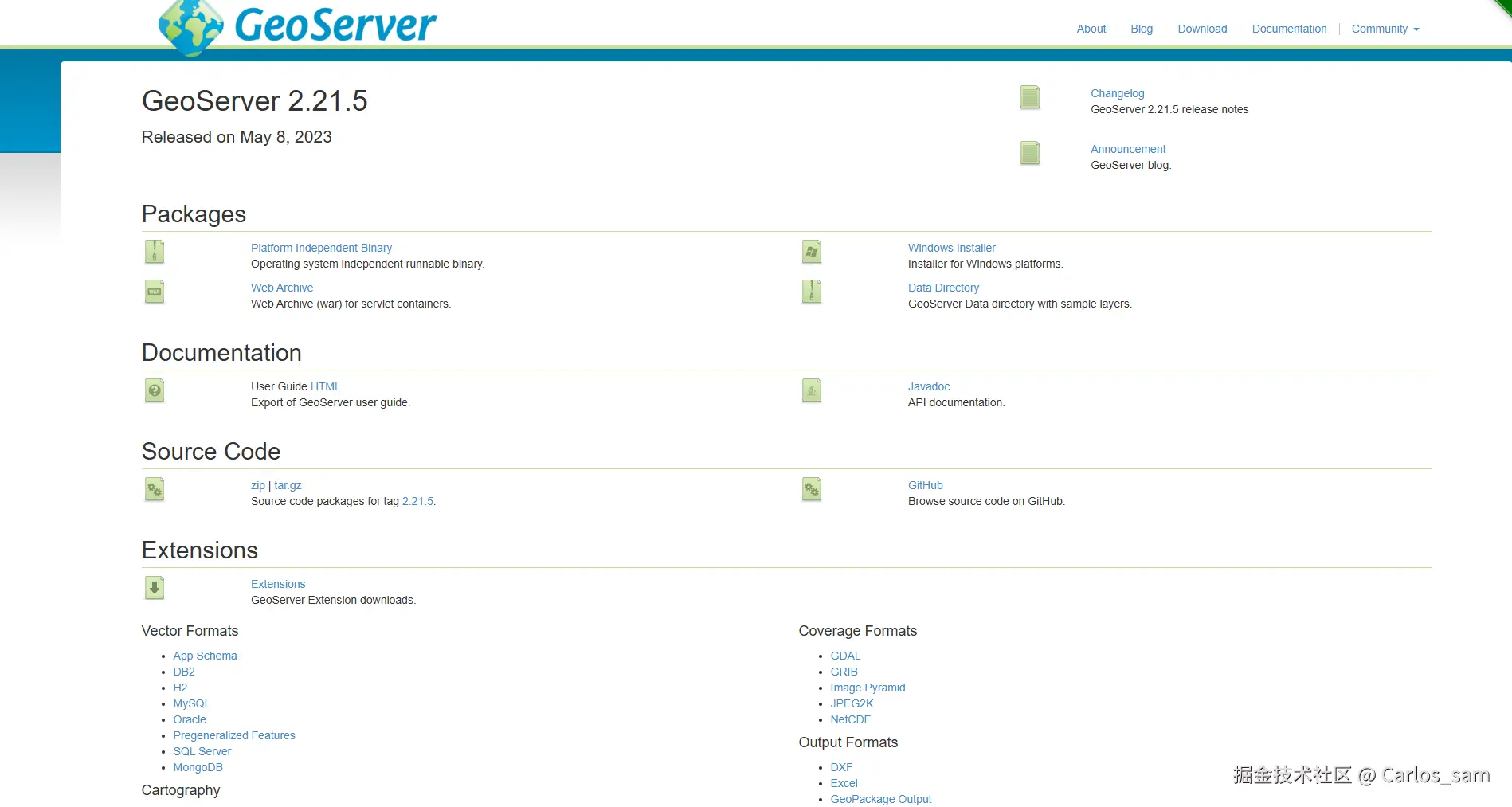 插件在官网中就可以下载(Download - GeoServer),但是注意要到自己所安装的对应geoserver版本的下载页面中去下载插件,如果下载了其它版本下的插件,可能会在启动geoserver时导致报错。