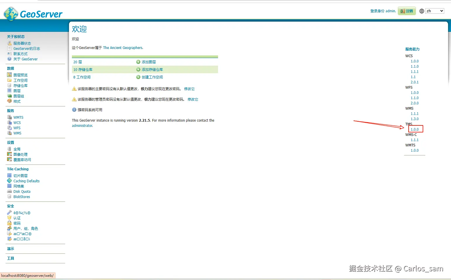 首先第一步我们要搞清楚我们所发布的矢量瓦片的TMS服务的url地址是什么。可以打开Goeserver去查看。