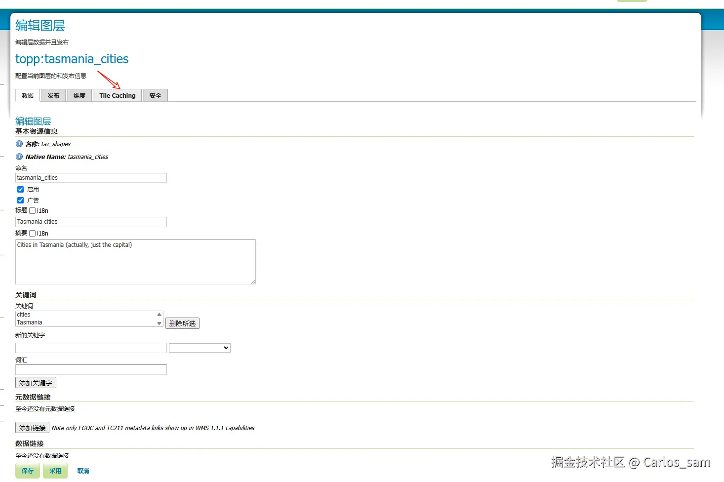 点击进入“图层编辑”页面,然后再进入“Tile Caching”选项卡