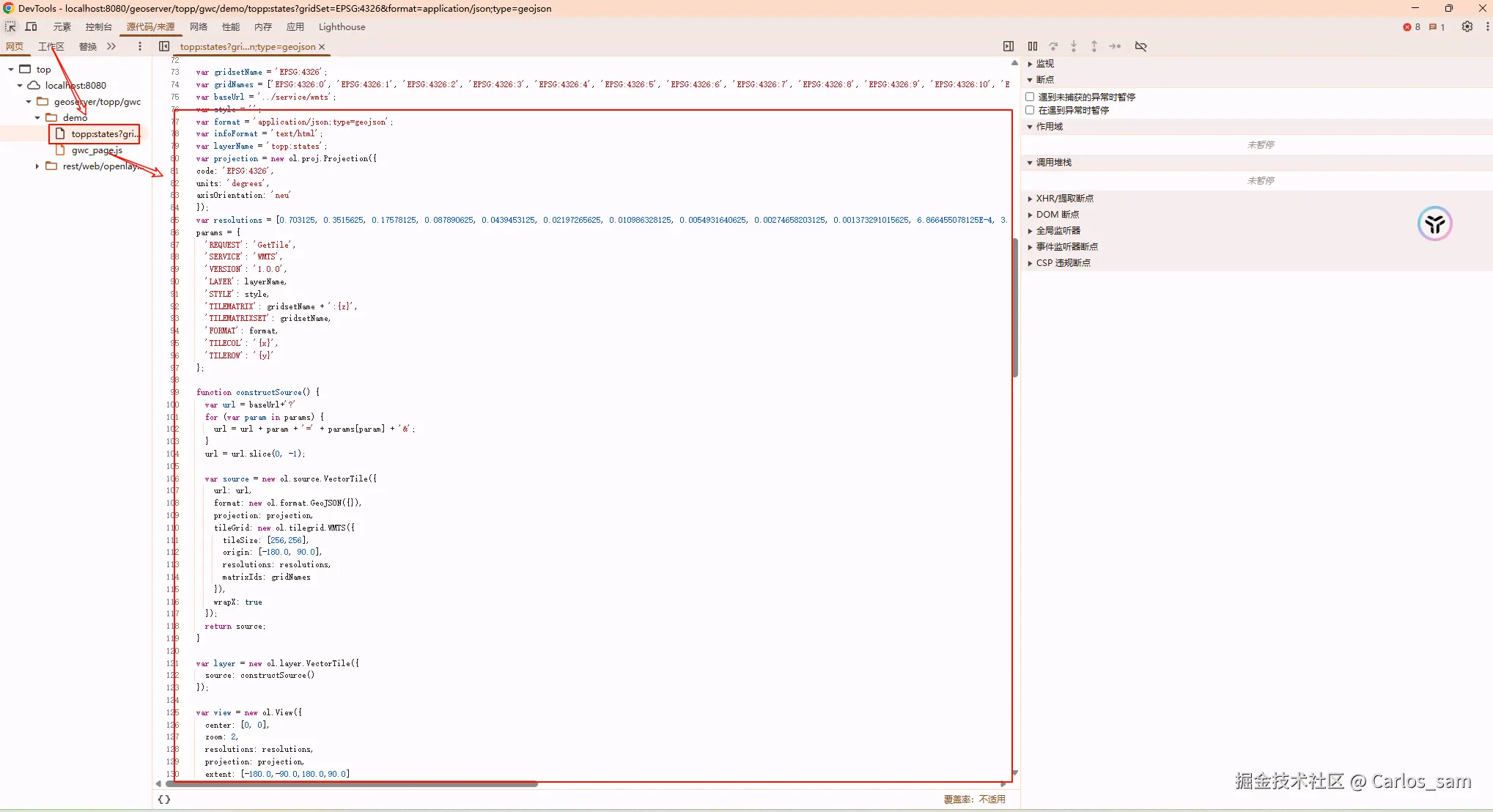 然后F12打开调试工具查看页面的源代码,在demo文件夹中就可以找到通过WMTS加载矢量切片的代码,直接照抄就可以了。