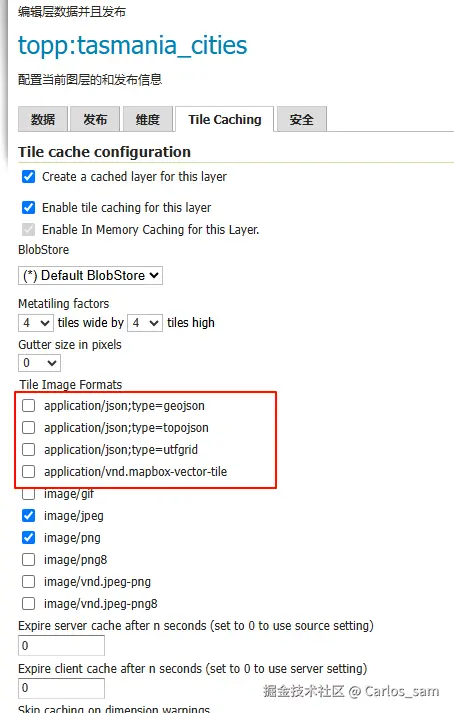 滚动页面到 "Tile Image Formats" 部分,勾选application/json;type=geojson、application/json;type=topojson和application/vnd.mapbox-vector-tile这几个选项(注意:这三个选项对应了三种不同格式的矢量切片数据,我们每勾选一种就会GeoServer就会制作发布一种对应格式的矢量切片)