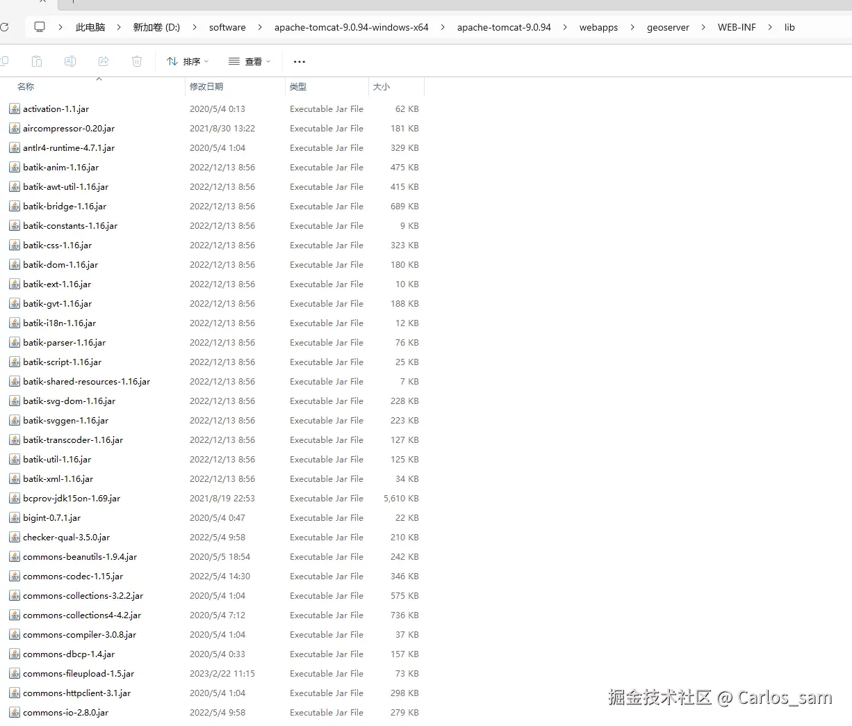 将复制好的文件放到geoserver的 WEB-INF/lib目录下,这个目录中都是各种.jar文件,比较好辨认。