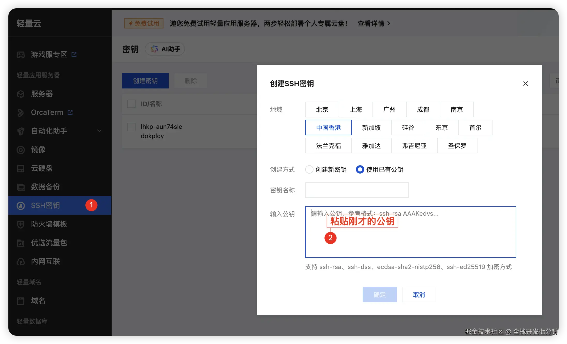 在腾讯云 SSH 密钥管理中添加,可以别名为 dokploy 用于区分。