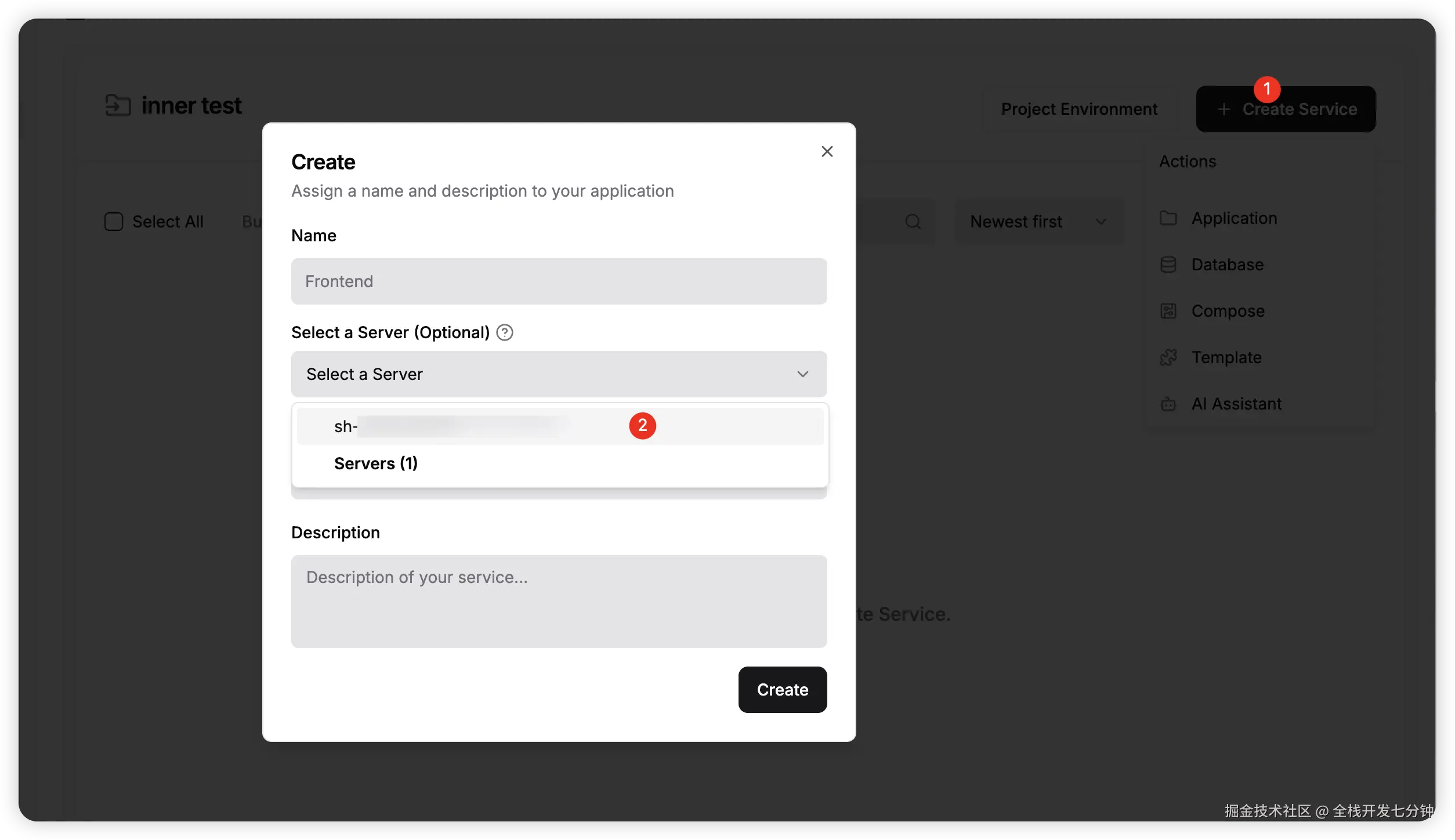 创建的时候注意要选择刚才添加的服务器,否则会部署到 dokploy 控制台所在的服务器上。