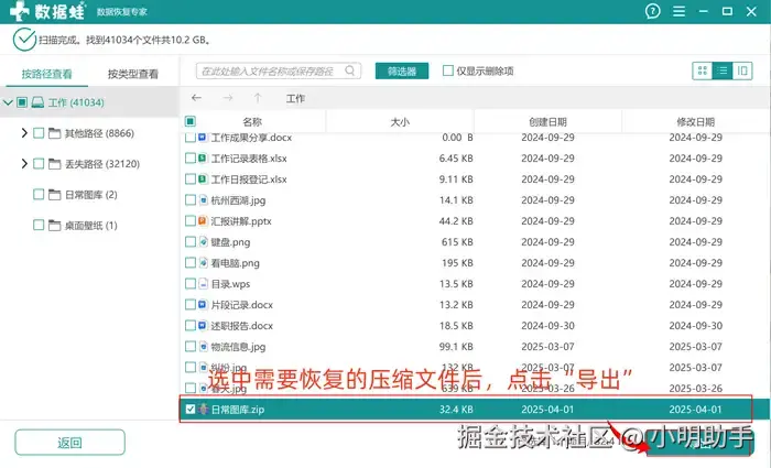 第2步:扫描结束后,在软件的指定位置上选择需要找回的文件,按下后表示勾选,点击“导出”;