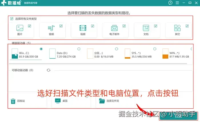 数据 蛙恢复专家是一款专门为电脑文件恢复而设计的专业软件。这款软件操作起来十分便捷,页面操作指导也相当明确,第一次使用的用户也不会感到十分困难。在软件的首页上,我们可以根据自己的需求选择需要通过扫描找回的文件类型,再选择压缩文件丢失的位置,做好以上准备就可以开始扫描了。
