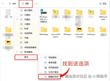 在此电脑中找到压缩包原存放的位置,点击“查看→显示→隐藏的项目”即可。