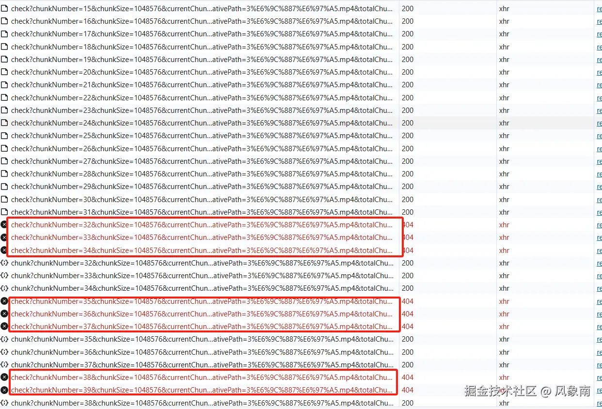 通过请求可以看到,红色的8个文件块 (32-39) 检查(check)失败后进行了上传(chunk),其他的已上传 (1-31) 块并没有重新上传。